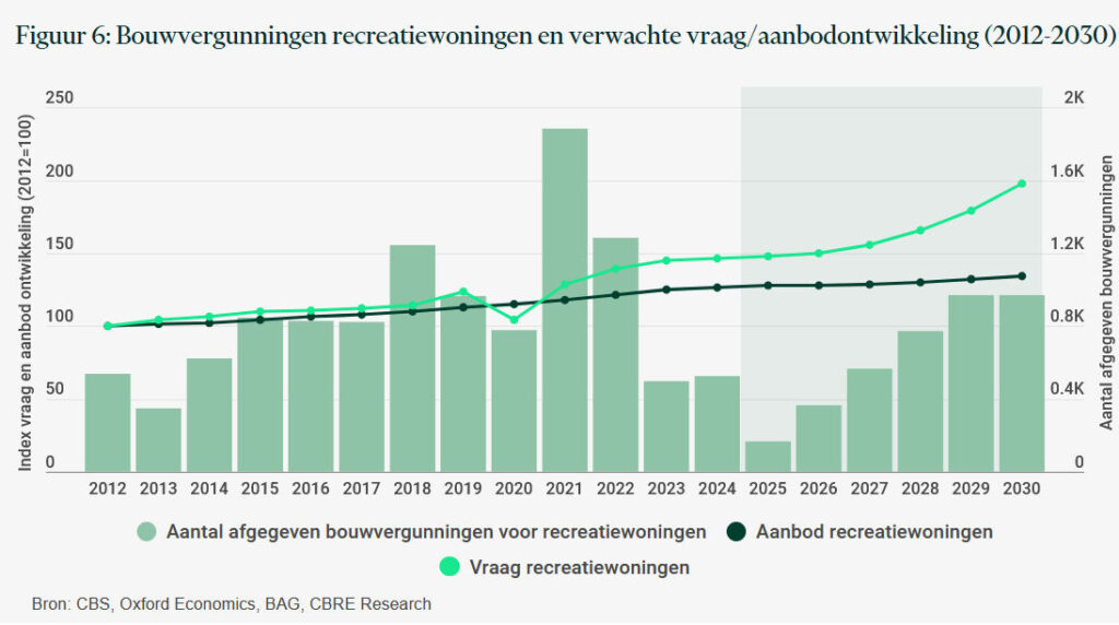 Een belangrijke onderliggende ontwikkeling die Vakantieparken als vastgoedsegment een steun in de rug geeft is de scheefgroei tussen vraag en aanbod. CBRE constateert dat het aantal overnachtingen in vakantieparken tussen 2012 en 2024 met 40% is gestegen. Het aantal vakantiewoningen nam in dezelfde periode toe met 26%.