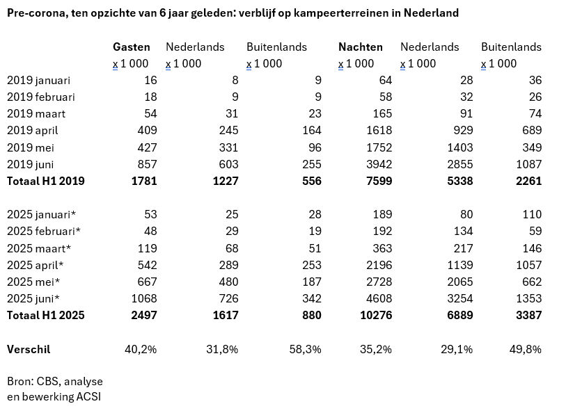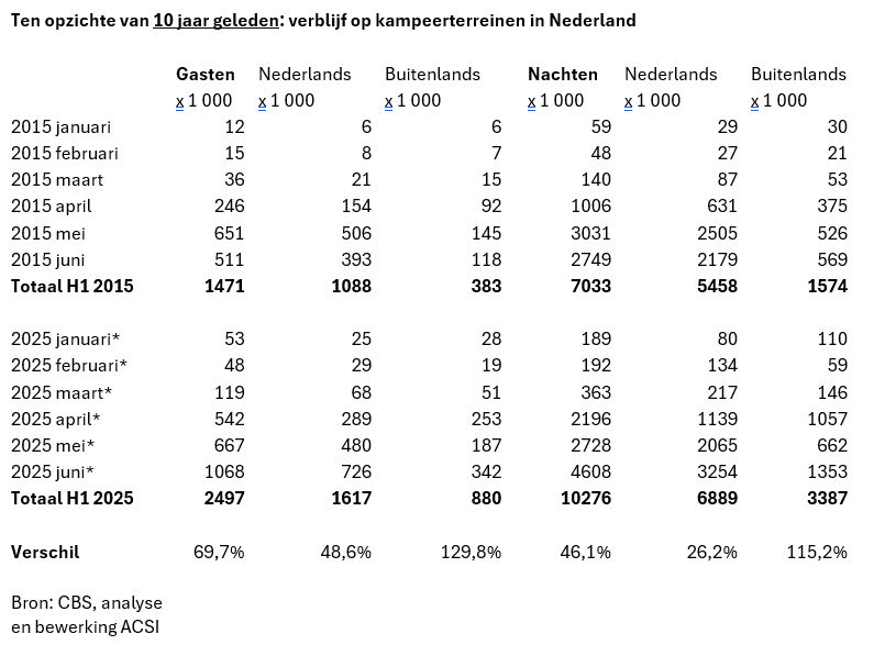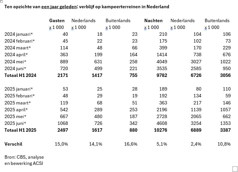 Uit de cijfers van het CBS kan geconcludeerd worden dat in de periode van januari tot en met juni 10.276.000 overnachtingen op Nederlandse campings werden geregistreerd. In dezelfde periode in 2024 waren dat er 9.782.000, hetgeen een groei van ruim 5 procent betekent. Twee derde van de kampeernachten (bijna 6,9 miljoen) kwam op conto van Nederlanders, terwijl buitenlandse kampeerders goed waren voor een derde van de overnachtingen (bijna 3,4 miljoen).