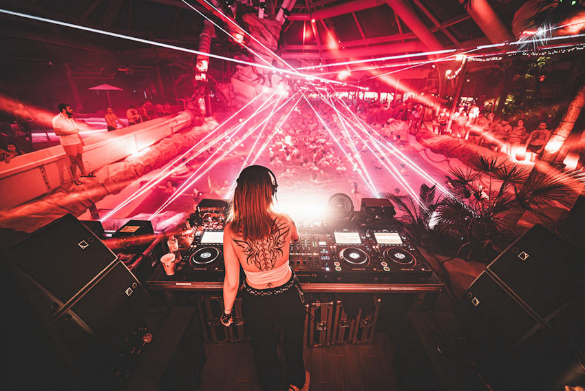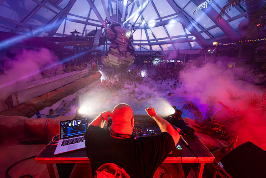 Tijdens de Wave Party’s wordt het podium tegenover het golfslagbad opgesteld, waardoor het hart van Aqualibi verandert in een aquatische dansvloer.