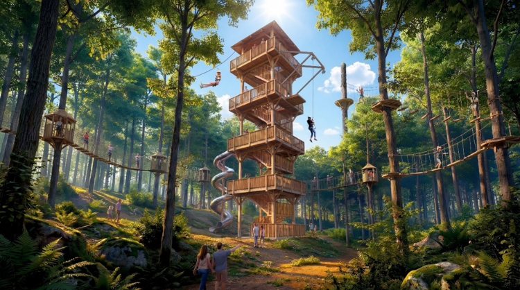 De gloednieuwe Wildwood-zone belichaamt perfect de ambitie van Adventure Valley Durbuy om natuur en avontuur nog aantrekkelijker en toegankelijker te maken voor iedereen. Centraal in de zone staat de indrukwekkende Wildwood Tower, een constructie in hout en staal van 25 meter hoog, die fungeert als visueel herkenningspunt en vertrekpunt van talrijke ervaringen. Vanop deze toren genieten bezoekers van een prachtig uitzicht over de omgeving, terwijl ze zich zonder uitrusting tussen de bomen bewegen. De meer avontuurlijke bezoekers kunnen zich wagen aan uitdagendere touwenparcours of een vrije val.