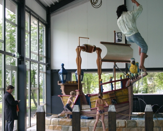 * Een zwembad met piratenboot en een piraat die boven het bad hangt. Uiteraard kun je in de daarnaast gelegen ruimtes douchen, is er kleedruimte en zijn er opbergkastjes voor de kleding.