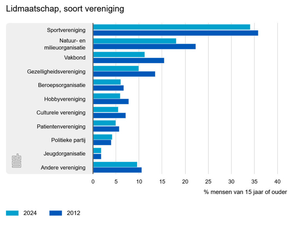 Veel Nederlanders beleven een groot deel van hun vrije tijd in verenigingsverband. Sportverenigingen (34%) en Natuur- en Milieu-organisaties (18%) waren het populairst in 2024. Maar het aantal lidmaatschappen loopt wel sterk terug. In 2024 was 62 procent van de mensen van 15 jaar of ouder lid van een of meer verenigingen. In 2012 was dat nog 70 procent. Dit meldt het Centraal Bureau voor de Statistiek (CBS) op basis van het onderzoek Sociale samenhang en welzijn.
