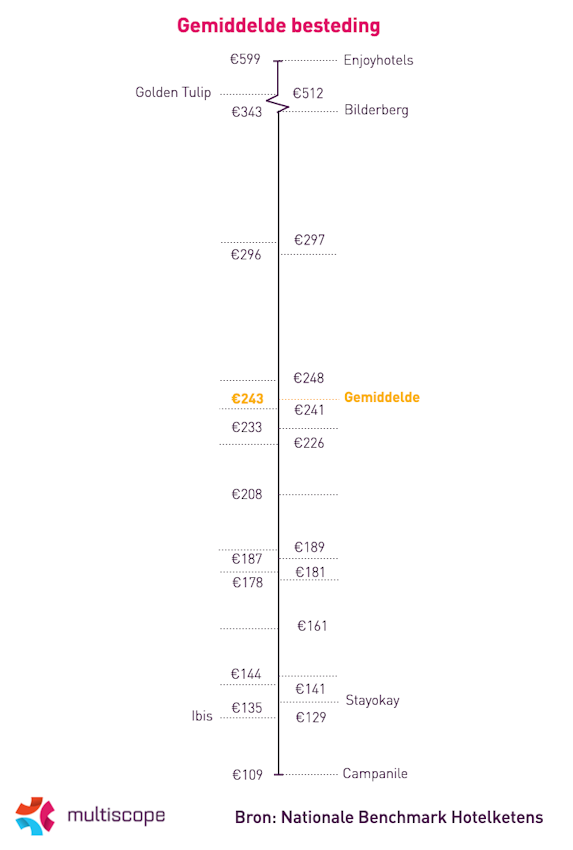 Bezoekers gaven gemiddeld € 243 uit per hotelbezoek. Dit betreft de totale rekening voor het gehele gezelschap. In de afgelopen drie jaar vonden 31,7 miljoen hotelbezoeken plaats, goed voor een totale besteding van bijna € 7,7 miljard bij hotelketens. Bij zes ketens is de gemiddelde besteding hoger dan het marktgemiddelde.