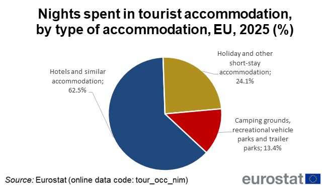 Het hotelsegment was ook in 2025 de favoriet, met een aandeel van 62,5 % in de totale overnachtingen in toeristische logiesverstrekkende bedrijven in de EU. Vakantie- en kortverblijfaccommodaties en campings waren goed voor respectievelijk 24,1% en 13,4% van de markt.