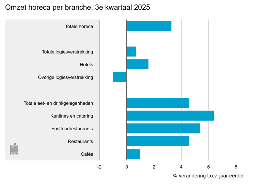 In Q3 van dit jaar hebben eet- en drinkgelegenheden 4,6 procent meer omgezet dan een jaar eerder. Kantines en catering realiseerden met 6,4 procent de grootste omzetstijging van de horecabranches. De omzet van fastfoodrestaurants groeide met 5,4 procent. De restaurants zetten 4,6 procent meer om en de cafés boekten 1 procent meer omzet dan in het derde kwartaal van 2024.