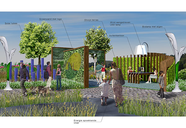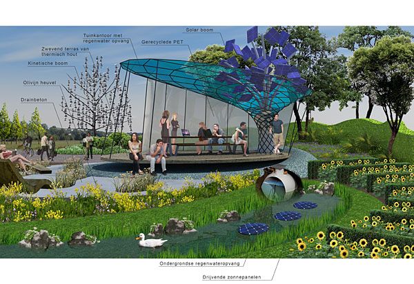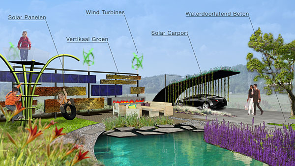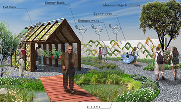 De tuin bundelt alle best practices op het vlak van de inrichting van tuinen en buitenruimten. De tuin zuivert bijvoorbeeld water en vangt regenwater ondergronds op. Ook verbouwt de tuin voedsel en kan er worden gekookt in een zonneoven. Daarnaast wekt de tuin energie op met een windmolen, een solar-boom en drijvende zonnepanelen. Olbertijn: “Wanneer je dit doortrekt naar alle tuinen, parken en bedrijfsterreinen dan levert dit een enorme vergroting op van de biodiversiteit, in combinatie met een geweldige besparing van grondstoffen en energie.”