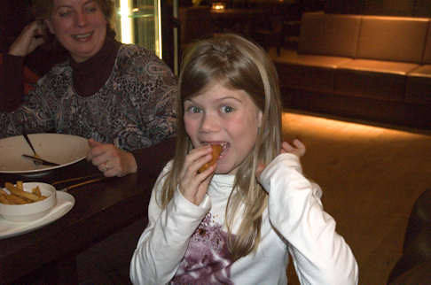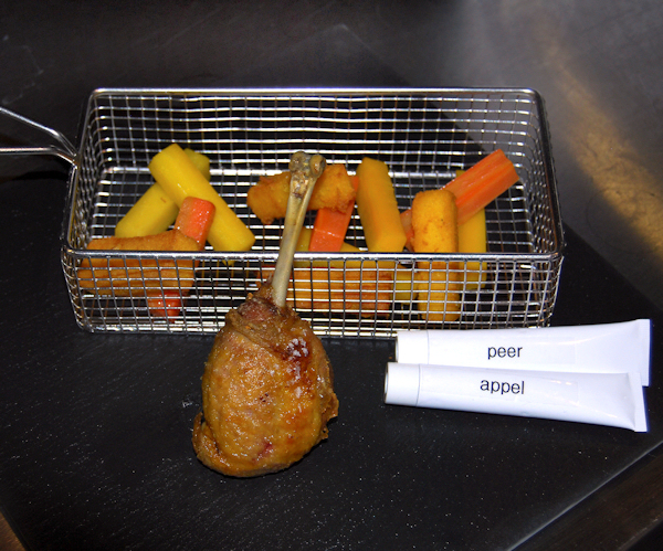 Met het kindermenu komt er wel wat bijzonders op tafel; een grote steen, met daarop een frituurmandje en tubes moes trekken meteen de aandacht van alle kinderen. Dat begint dus goed. De grote favoriet is de polenta. Iedereen is aangenaam verrast over deze lekkere knapperige frietvervangers; beter dan friet. De perenmoes biedt een smaak die voor mij in ieder geval nog onbekend is. Maar wel erg lekker; net als de zelfgemaakte appelmoes. Ook de kip en beetgare groenten zijn prima van smaak. De kinderen zijn nieuwsgierig genoeg om te proeven, maar komen toch snel tot de ontdekking; groente!; en dat is niet hun favoriet.”