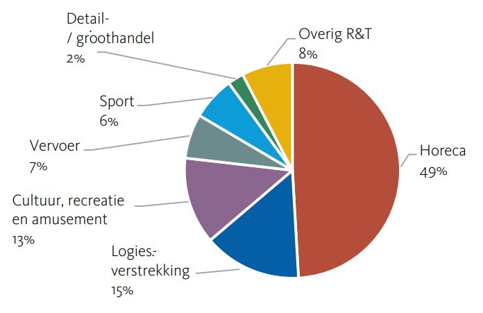 In de vrijetijdssector is de helft van de werkgelegenheid te vinden bij restaurants, cafés, cafetaria’s etc. (deze groep wordt hier aangeduid als ‘Horeca’, maar dus zonder hotels; zie figuur 1). Daarna volgen Logiesverstrekking (15 procent) en de groep Cultuur, recreatie en amusement (13 procent). De verhouding tussen deze subsectoren is in de afgelopen jaren nauwelijks veranderd.