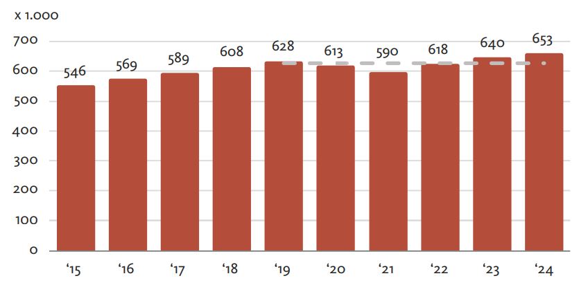 Maar is de sector daarmee weer terug op niveau? We kunnen ook kijken naar het absolute aantal banen in de R&T-sector. In het jaar vóór de coronacrisis (2019) waren er 628 duizend banen. In 2022 was de werkgelegenheid bijna op het niveau van 2019, en in 2023 lag het aantal banen alweer hoger dan voor de crisis (640 duizend banen; zie figuur 3).