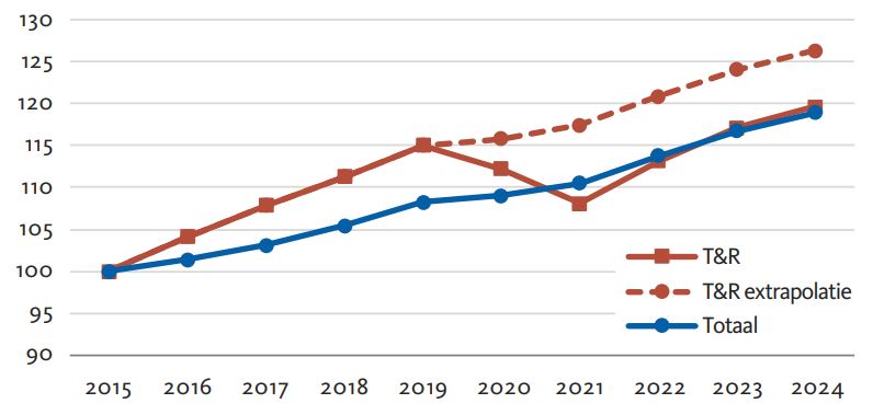 Is de R&T-sector dus hersteld van de coronacrisis in 2022 (zie figuur 2) óf in 2023 (zie figuur 3)? Het is waarschijnlijk dat het huidige aantal banen in de sector hoger zou liggen wanneer er geen beperkende maatregelen waren geweest. Dat wordt duidelijk in figuur 4 waarin de geïndexeerde ontwikkeling van de R&T-sector en de totale werkgelegenheid zijn weergegeven. Het aantal banen in de R&T-sector nam tussen 2015 en 2019 sterker toe dan gemiddeld in Nederland (dit is overigens al vanaf de start van LISA in 1996 het geval). Ook in de jaren 2022 t/m 2024 was de groei bovengemiddeld.