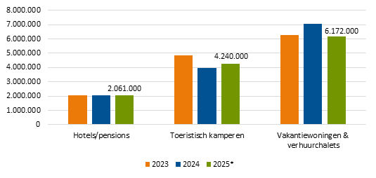 Het aantal overnachtingen op Zeeuwse huisjesterreinen is in 2025 met 12% gedaald. Daarmee ligt het niveau lager dan in 2023. In Zeeuwse hotels bleef het aantal overnachtingen in 2025 stabiel ten opzichte van voorgaande jaren. Campings in Zeeland noteerden een stijging van 7% in 2025. Deze groei was echter niet voldoende om de sterke daling van een jaar eerder volledig goed te maken.